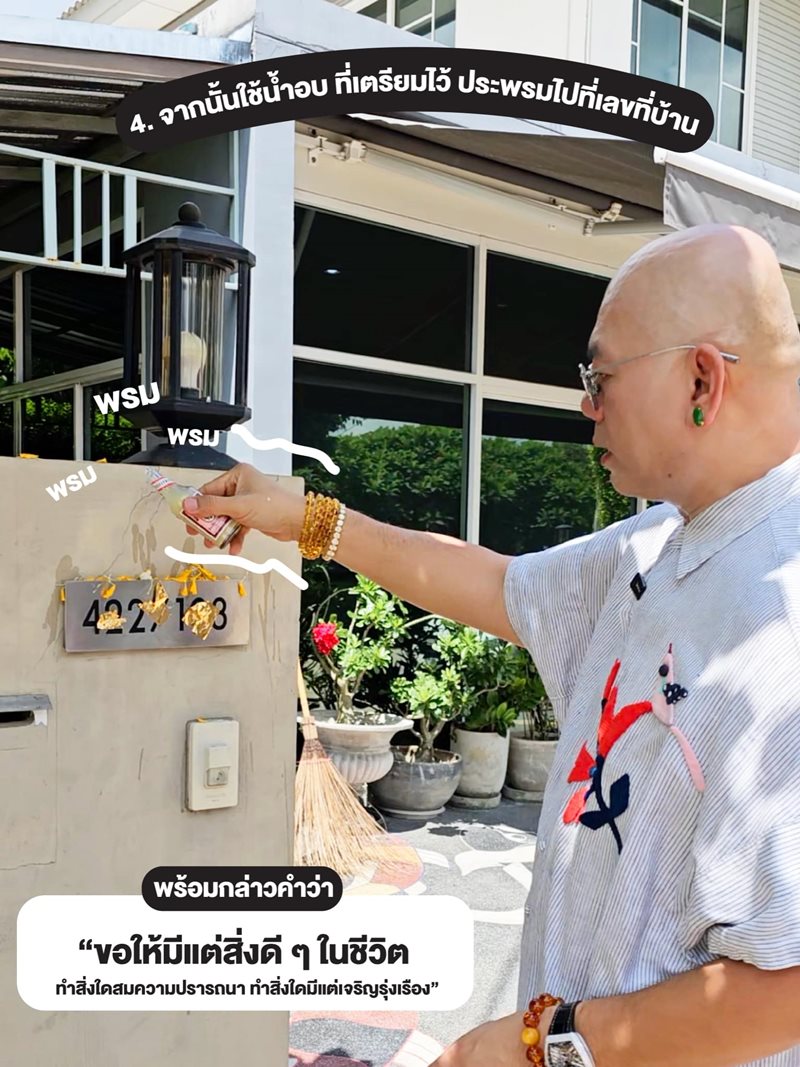 1. นำผ้าขาวชุบน้ำ เช็ดป้ายเลขที่บ้าน ปัดจากซ้ายไปขวา พร้อมกล่าวดังนี้