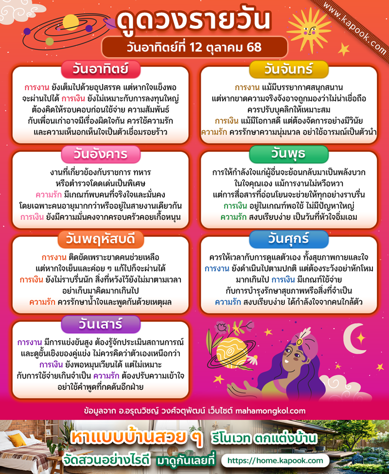 คำพยากรณ์ประจำวันอาทิตย์ที่ 12 ตุลาคม 2568 ตรงกับวันแรม 5 ค่ำ เดือน 11 ปีมะเส็ง ค.ศ.2025 ฤกษ์บนดาวจันทร์เกาะมฤคศิระ ฤกษ์ล่างวันกาลทิน กาลโยควันโลกาวินาศ นักษัตรฤกษ์ที่ 5 เทศาตรีฤกษ์ ต่อด้วยเทวีฤกษ์ ดาวจันทร์เกาะเทศาตรีฤกษ์ และโคจรเข้าเกาะเทวีฤกษ์ เวลา15.08 น. ห้ามประกอบการมงคล ห้ามถอยรถใหม่ออกจากอู่ วันนี้แม้ฤกษ์บนดีแต่กาลโยคกลับเสียทำให้อยู่ในลักษณะ “ฟ้าเปิดแต่ดินปิด” คือสิ่งที่ดูราบรื่นภายนอก แท้จริงแฝงแรงเสื่อมอยู่ภายใน ไม่เหมาะกับเริ่มต้นกิจกรรมสำคัญ ส่วนผู้ที่อยู่ในสายอาชีพที่ต้องติดต่อเจรจาก็ควรหลีกเลี่ยงการลงนามหรือทำสัญญา ความรัก ควรสงบปากสงบคำเพราะมีแนวโน้มเกิดความเข้าใจผิดจากคำพูดที่ไม่ตั้งใจ