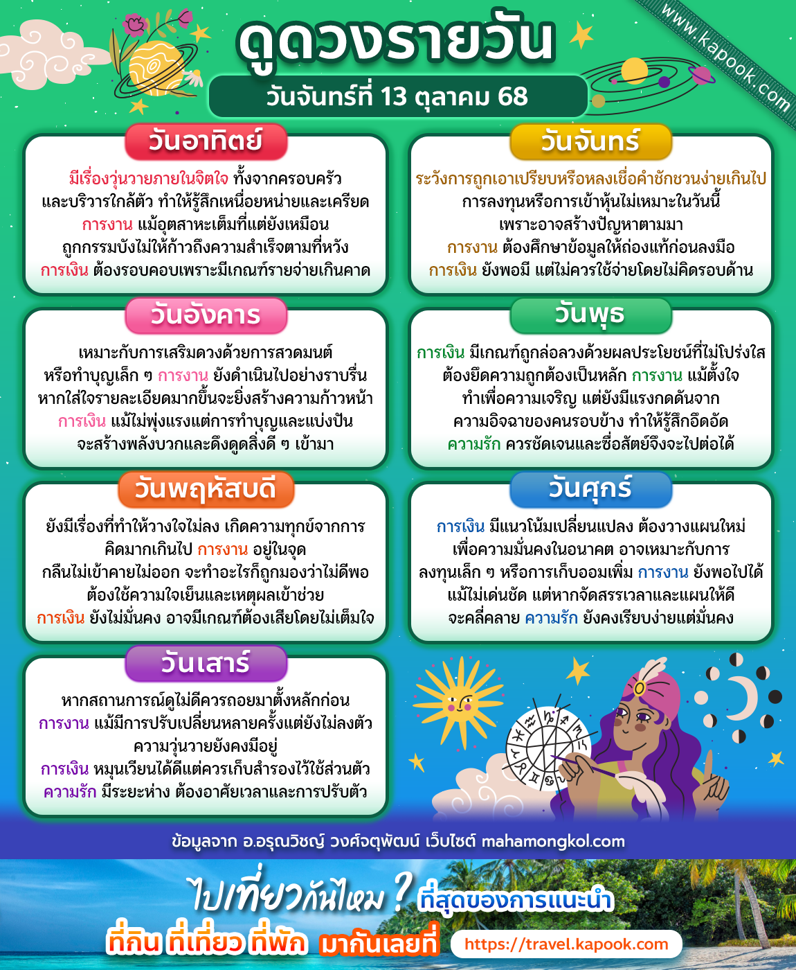 - คนเกิดวันจันทร์ : ระวังการถูกเอาเปรียบหรือหลงเชื่อคำชักชวนง่ายเกินไป การลงทุนหรือการเข้าหุ้นไม่เหมาะในวันนี้เพราะอาจสร้างปัญหาตามมา การงานต้องศึกษาข้อมูลให้ถ่องแท้ก่อนลงมือ การเงินยังพอมี แต่ไม่ควรใช้จ่ายโดยไม่คิดรอบด้าน