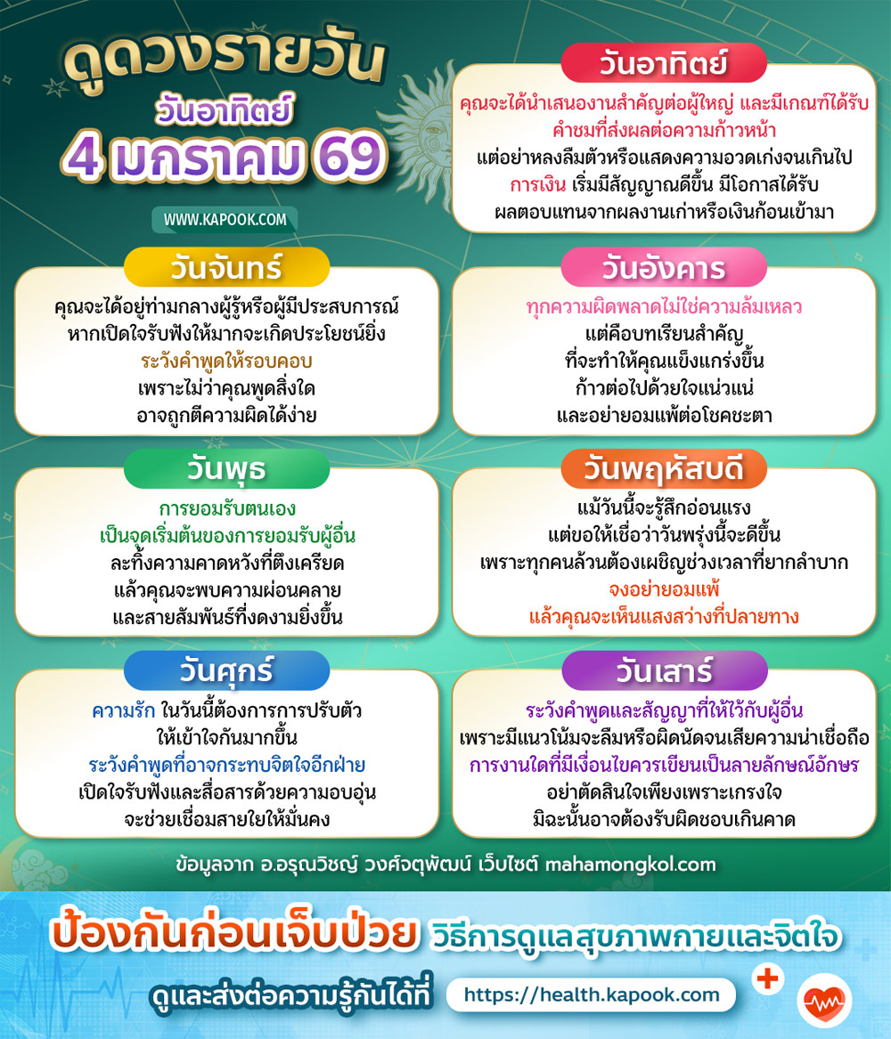 คำพยากรณ์ประจำวันอาทิตย์ที่ 4 มกราคม 2569 ตรงกับวันแรม 1 ค่ำ เดือน 2 ปีมะเส็ง จ.ศ. 1387 ค.ศ. 2026 ฤกษ์บนดาวจันทร์เกาะปุนรวสุ ฤกษ์ล่างวันทักทิน ทินกาล ดิถีฤกษ์ไชย กาลโยควันโลกาวินาศ นักษัตรฤกษ์ที่ 7 เพชฌฆาตฤกษ์ ต่อด้วยราชาฤกษ์ ห้ามประกอบการมงคลห้ามถอยรถใหม่ออกจากอู่ เป็นวันที่ต้องระวังภัยธรรมชาติและอุบัติเหตุให้มาก โดยเฉพาะเกี่ยวกับสภาพอากาศและภัยทางน้ำ นักท่องเที่ยวควรงดกิจกรรมทางน้ำอย่าฝืนธรรมชาติ ห้ามประมาทเด็ดขาด การงาน: เต็มไปด้วยความกดดัน และอุปสรรคที่ไม่คาดฝัน การเจรจาอาจล้มเหลว หรือถูกเลื่อนนัดกะทันหัน งานกลางแจ้งต้องระวังฝนฟ้าทำลายข้าวของเสียหาย การเงิน: เสี่ยงสูญเสีย ห้ามลงทุน ห้ามค้ำประกัน ระวังทรัพย์สินเสียหาย ต้องสำรองเงินสดไว้ใช้ในยามฉุกเฉิน ความรัก: อารมณ์แปรปรวนดั่งพายุ จิตใจอ่อนไหว เรื่องเล็กจะกลายเป็นเรื่องใหญ่ จากความหึงหวง หรือความเข้าใจผิด
