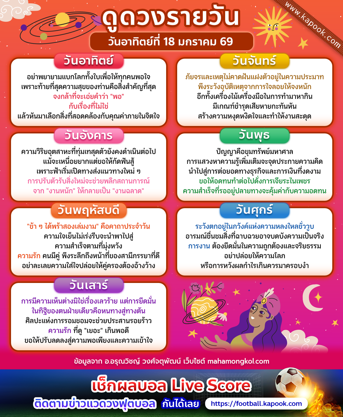 คำพยากรณ์ประจำวันอาทิตย์ที่ 18 มกราคม 2569 ตรงกับวันแรม 15 ค่ำ เดือน 2 ปีมะเส็ง จ.ศ. 1387 ค.ศ. 2026 ฤกษ์บนดาวจันทร์เกาะปุรพษาฒ ฤกษ์ล่างวันปลอด กาลโยควันโลกาวินาศ นักษัตรฤกษ์ที่ 20 มหัทธโนฤกษ์ ต่อด้วยโจโรฤกษ์ ดาวจันทร์เกาะมหัทธโนฤกษ์ โคจรเข้าเกาะโจโรฤกษ์ เวลา 11.46 น. และยกเข้าราศีมังกร เวลา 18.13 น. ห้ามประกอบการมงคล ห้ามถอยรถใหม่ออกจากอู่ การงาน : ช่วงเช้าพอขยับขยายผลประโยชน์ได้บ้าง แต่หลัง 11.46 น. บรรยากาศจะเริ่มเครียดมีการแก่งแย่งชิงดีหรือถูกกดดัน ระวังเอกสารสัญญาถูกบิดเบือน การเงิน : รายจ่ายออกมากกว่ารายรับ มียอดฉุกเฉินจากการแก้ปัญหาเฉพาะหน้า อย่าลงทุนก้อนใหญ่หรือทำธุรกรรมที่มีความเสี่ยงสูง ความรัก : เปราะบางดั่งแก้ว ระวังคำพูดประชดประชันจะกลายเป็นประเด็นในครอบครัว คนโสดระวังเจอคนแสบ เข้ามาพัวพันให้เดือดร้อนใจ