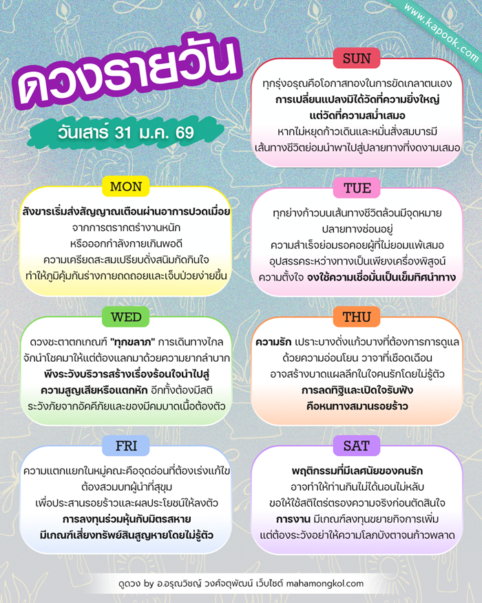 คำพยากรณ์ประจำวันเสาร์ที่ 31 มกราคม 2569 ตรงกับวันขึ้น 13 ค่ำ เดือน 3 ปีมะเส็ง จ.ศ. 1387 ค.ศ. 2026 ฤกษ์บนดาวจันทร์เกาะปุนรวสุ ฤกษ์ล่างวันดิถีฤกษ์ไชย ดิถีเรียงหมอน กาลโยควันปลอด นักษัตรฤกษ์ที่ 7 เพชฌฆาตฤกษ์ ต่อด้วยราชาฤกษ์ ดาวจันทร์เกาะเพชฌฆาตฤกษ์ ยกเข้าราศีกรกฎ เวลา 21.33 น. และโคจรเข้าเกาะราชาฤกษ์ เวลา 03.06 น. ประกอบการมงคลได้ดี ถอยรถใหม่ออกจากอู่ได้ดี การงาน : เป็นวันแห่งการสรุปยอดและปิดโครงการได้อย่างสวยงาม การเจรจาสัญญาใหม่ ๆ มีโอกาสได้รับผลประโยชน์ตอบแทนสูง แต่ต้องตรวจสอบข้อกฎหมายและเอกสารให้รัดกุมรอบคอบ การเงิน : กระแสเงินไหลเวียนดีมาก เหมาะสำหรับการจับจ่ายลงทุนในสินทรัพย์ถาวร การออกรถใหม่ในวันนี้จะนำพาโชคลาภและบารมีมาสู่เจ้าของรถอย่างต่อเนื่อง ความรัก : หวานชื่นและมั่นคงตามเกณฑ์ดิถีเรียงหมอน คู่รักที่วางแผนอนาคตร่วมกันจะได้รับแรงสนับสนุนที่ดีจากผู้ใหญ่ คนโสดมีเกณฑ์พบคนที่มีฐานะทางสังคมดีจากการติดต่อประสานงาน