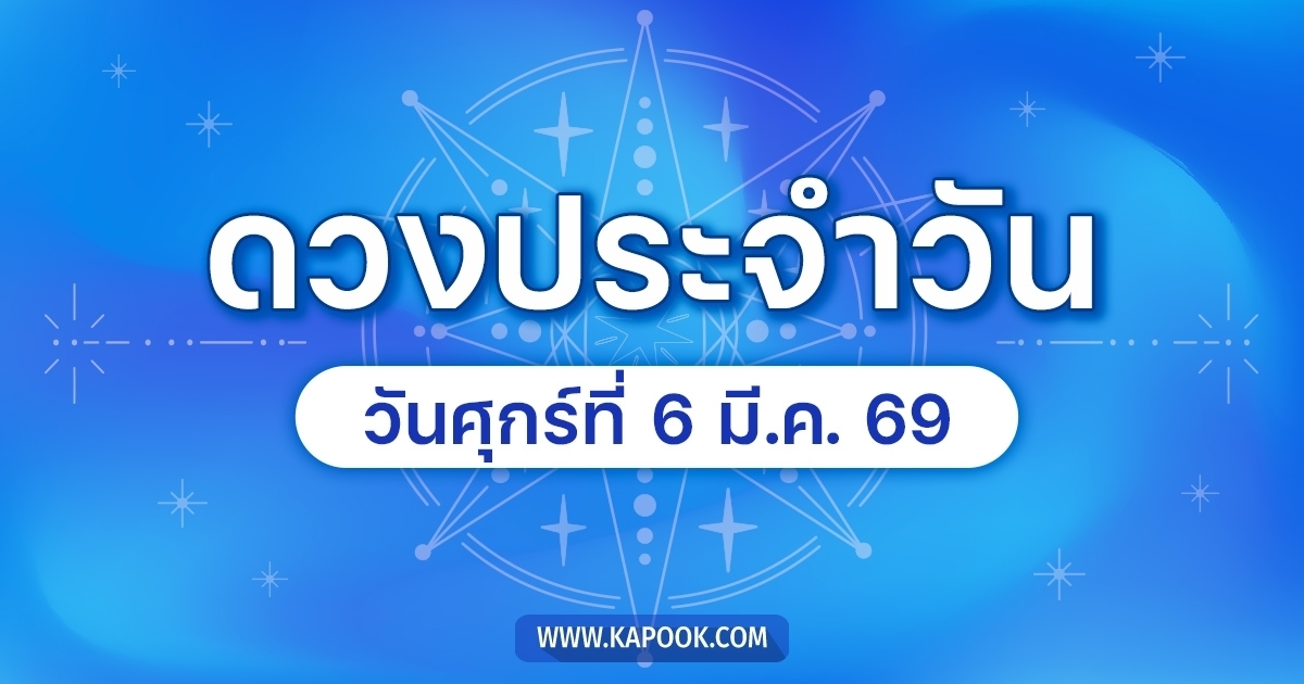 ดูดวงรายวัน ดวงวันนี้แม่น ๆ ฟรี ประจำวันศุกร์ที่ 6 มีนาคม 2569 ตรงกับวันแรม 3 ค่ำ เดือน 4 ปีมะเส็ง จ.ศ. 1387 ค.ศ. 2026 ทั้งดูดวงความรัก ดวงเนื้อคู่ การเงิน การงาน สุขภาพ ชีวิต และครอบครัว สำหรับท่านที่เกิดวันจันทร์-อาทิตย์ และผู้ที่ชื่นชอบการตรวจดวงชะตา และอยากรู้ชะตาชีวิตวันนี้เป็นอย่างไร ตามไป ดูดวงรายวัน กันเลย