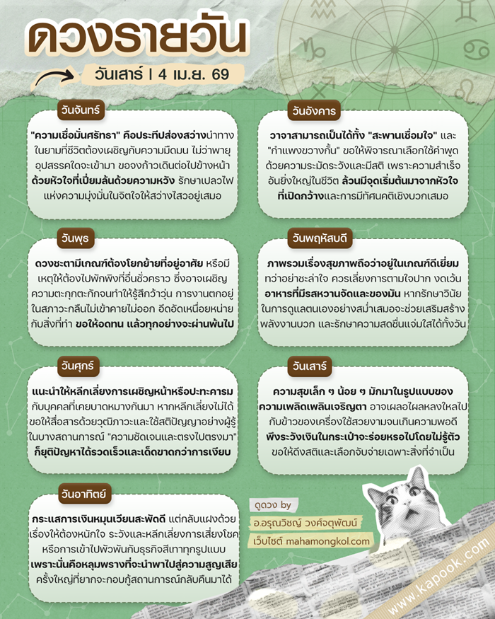 คำพยากรณ์ประจำวันเสาร์ที่ 4 เมษายน 2569 ตรงกับวันแรม 2 ค่ำ เดือน 5 ปีมะเส็ง จ.ศ. 1387 ค.ศ. 2026 ฤกษ์บนดาวจันทร์เกาะสวาติ ฤกษ์ล่างวันดิถีมหาสูญ กาลโยควันปลอด นักษัตรฤกษ์ที่ 15 เทวีฤกษ์ ต่อด้วยเพชฌฆาตฤกษ์ ดาวจันทร์เกาะเทวีฤกษ์ และโคจรเข้าเกาะเพชฌฆาตฤกษ์ เวลา 23.07 น. ห้ามประกอบการมงคล ห้ามถอยรถใหม่ออกจากอู่ วันนี้ใจต้องนิ่ง ห้ามต่อปากต่อคำกับคนพาล เป็นวันแห่งการเก็บตัว ทำงานรูทีนให้เรียบร้อยที่สุด สิ่งที่ควรระวังที่สุด คือเรื่องอารมณ์ชั่ววูบที่อาจนำไปสู่การแตกหัก การงาน: นิ่งสงบและควรเน้นการสะสางงานค้างมากกว่าการริเริ่มสิ่งใหม่ ห้ามตัดสินใจเรื่องสำคัญหรือเซ็นสัญญาที่มีผลผูกพันระยะยาว เพราะจะสูญเปล่าในภายหลัง การเงิน: เงินไหลเวียนแบบ "เข้ามือซ้ายออกมือขวา" ระวังรายจ่ายจากการใจอ่อนหรือการถูกหลอกลวง ลาภผลที่หวังไว้อาจกลายเป็นอากาศธาตุ ห้ามลงทุนเสี่ยงดวงเด็ดขาด ความรัก: เปราะบางและเสี่ยงต่อการเข้าใจผิดจากการฟังความข้างเดียว คู่รักควรหลีกเลี่ยงการจับผิดและประคองอารมณ์ให้ดี คนโสดระวังการพบเจอคนที่ไม่จริงใจ