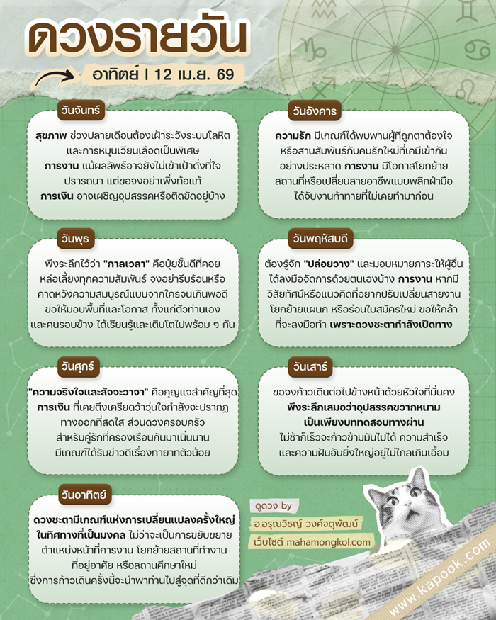 คำพยากรณ์ประจำวันอาทิตย์ที่ 12 เมษายน 2569 ตรงกับวันแรม 10 ค่ำ เดือน 5 ปีมะเส็ง จ.ศ.1387 ค.ศ.2026 ฤกษ์บนดาวจันทร์เกาะศรวณะ ฤกษ์ล่างวันลอย ดิถีเรียงหมอน กาลโยควันโลกาวินาศ นักษัตรฤกษ์ที่ 22 ภูมิปาโลฤกษ์ ต่อด้วยเทศาตรีฤกษ์ ดาวจันทร์เกาะภูมิปาโลฤกษ์ โคจรเข้าเกาะเทศาตรีฤกษ์ เวลา16.46น. และยกเข้าราศีกุมภ์ เวลา05.16น.(คืนนี้) ห้ามประกอบการมงคล ห้ามถอยรถใหม่ออกจากอู่ กาลพิเศษเป็นวันป่าชุมชนชายเลนไทย จงระวังภัยบนท้องถนนเป็นทวีคูณ ความประมาทจะนำพาไปสู่ความหายนะ จงเดินทางอย่างมีสติและรักษาสุขภาพจิตใจให้แจ่มใสท่ามกลางการจราจรที่ติดขัด การงาน: เหมาะแก่การพักผ่อนหรืองานวางรากฐาน หลัง16.46น.ไปแล้วการเดินทางจะหนาแน่นและวุ่นวาย ห้ามตัดสินใจเรื่องสำคัญเพราะการเจรจาจะล้มเหลว การเงิน: รายจ่ายสูงมากจากการเดินทางและการเตรียมงานเทศกาล ลาภผลมีเข้ามาแบบฉาบฉวยแต่ระวังจะเสียเงินก้อนใหญ่เพราะอุบัติเหตุหรือความประมาท ความรัก: ความสัมพันธ์ให้ยังมั่นคงอยู่ได้ แต่อย่าหยิบยกเรื่องราวความขัดแย้งในอดีตมาพูดกันในระหว่างเดินทาง เพราะจะจบไม่สวย คนโสดระวังการพบเจอคนแปลกหน้าระหว่างทาง